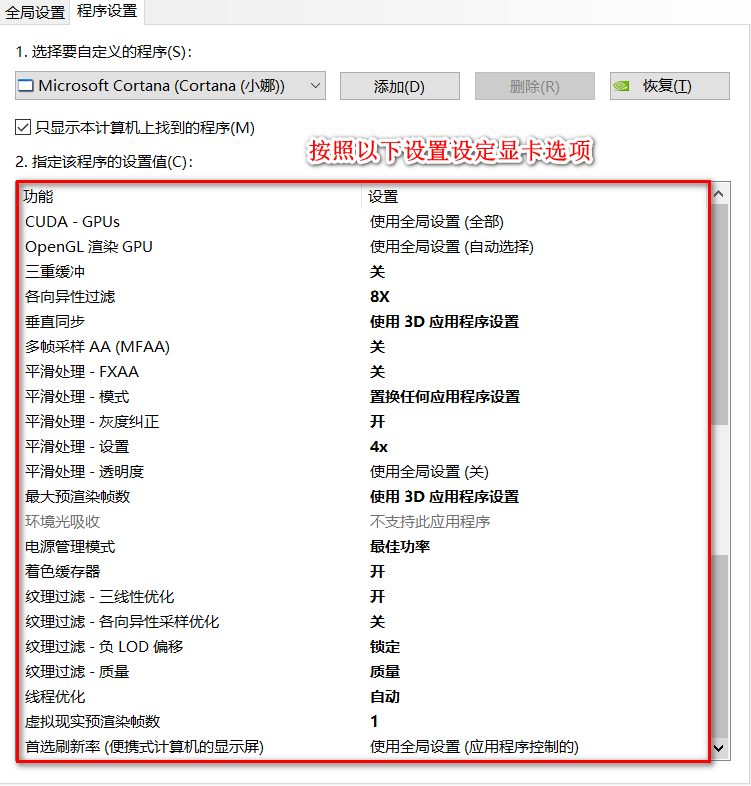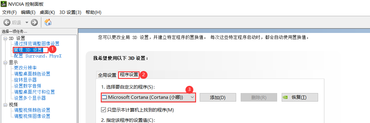 Windows 10小娜不停抽搐? 发表于 2019-12-31 更新于 2021-10-15 分类于 Windows Question 本文字数: 148 阅读时长 ≈ 1 分钟 前言: 最近打开小娜后发现Windows 10小娜在不停抽搐,看起来很不舒服,于是乎就想把“她”这个病给治一下! 系统版本:Windows 10 Pro 1909 显卡型号:NVIDIA GeForce GTX 1070 治疗过程 打开显卡控制面板 按照如下图所示找到小娜 按照如图所示配置小娜,然后保存配置 重启系统 小娜康复