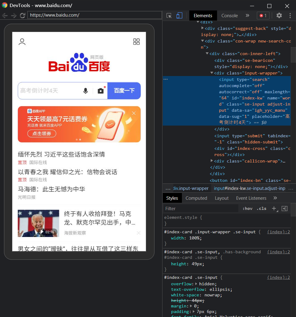 - 这个App内置了一个 webview,这个webview缺省就是打开百度的网址,和native代码没有交互, 完全可以用浏览器直接以手机模式查看网页元素