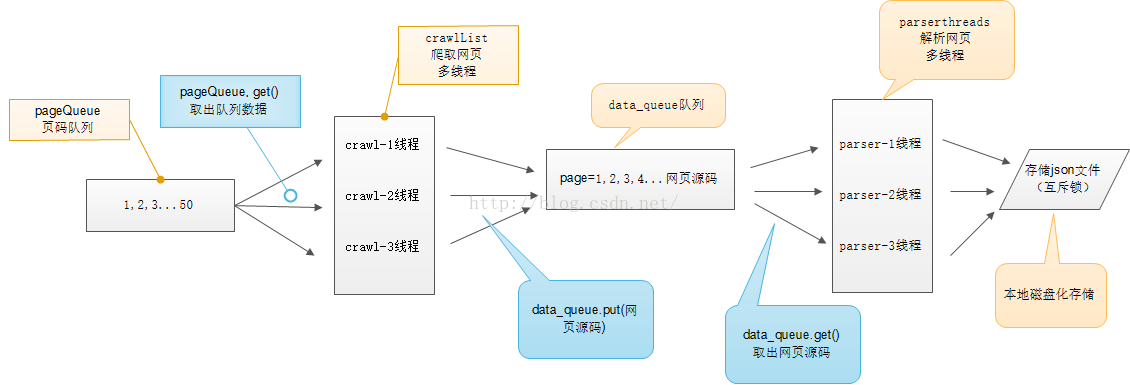 - 内容队列:下载线程往队列中put数据,解析线程从队列get数据
