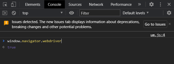 使用 Selenium 时会被部分网站监测到,这时你在 Selenium 打开的浏览器下的按 F12 进入检查,然后在 Console 下输入 window.navigator.webdriver 会发现结果为 true,如图: