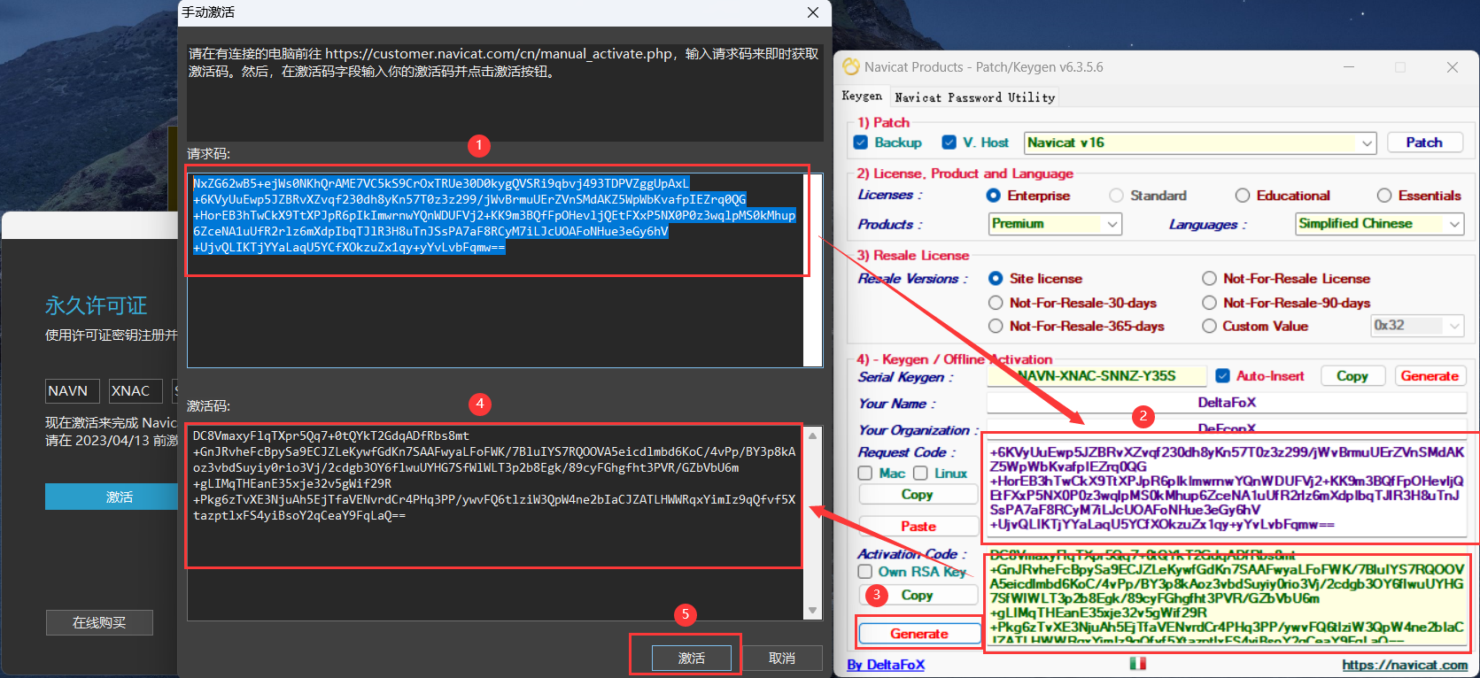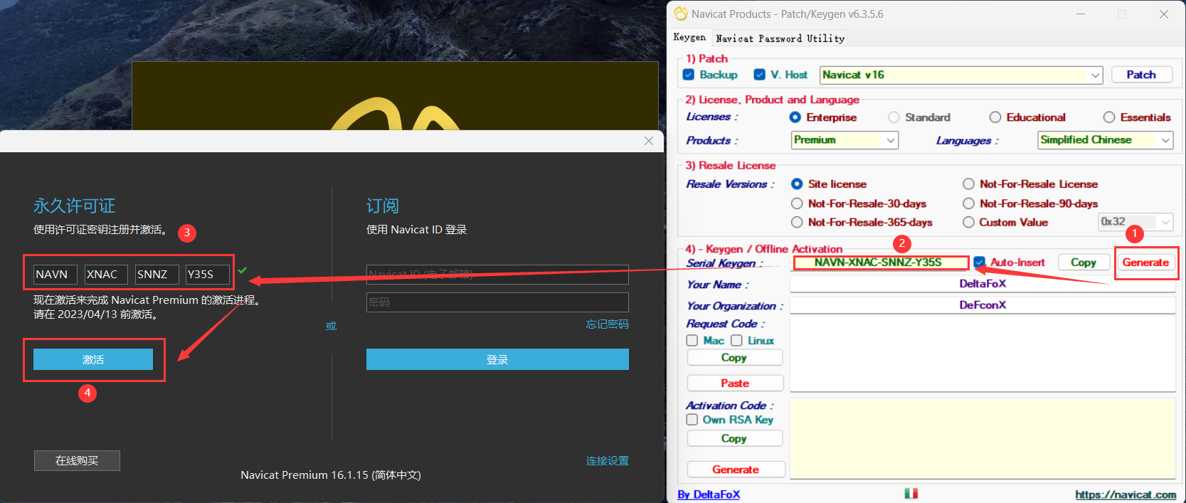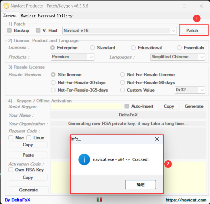 - 将 请求码 复制到破解补丁中,然后点击破解补丁左下角的 Generate 生成 激活码,然后将 激活码 复制到 Navicat 软件中(正常情况下会自动填充),然后点击 激活 按钮