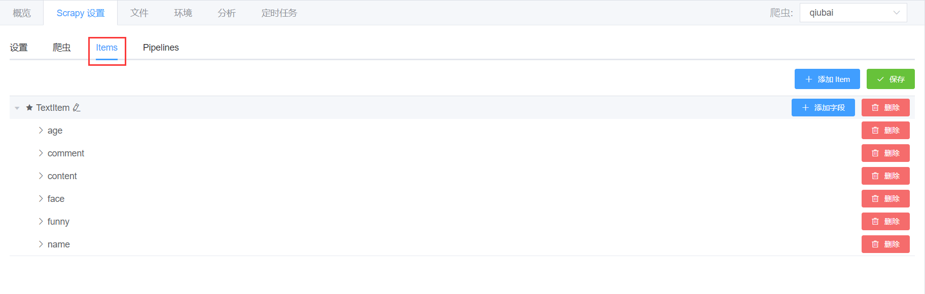 - 第三个标签是【Items】,这里是定义爬虫抓取项的地方,会将