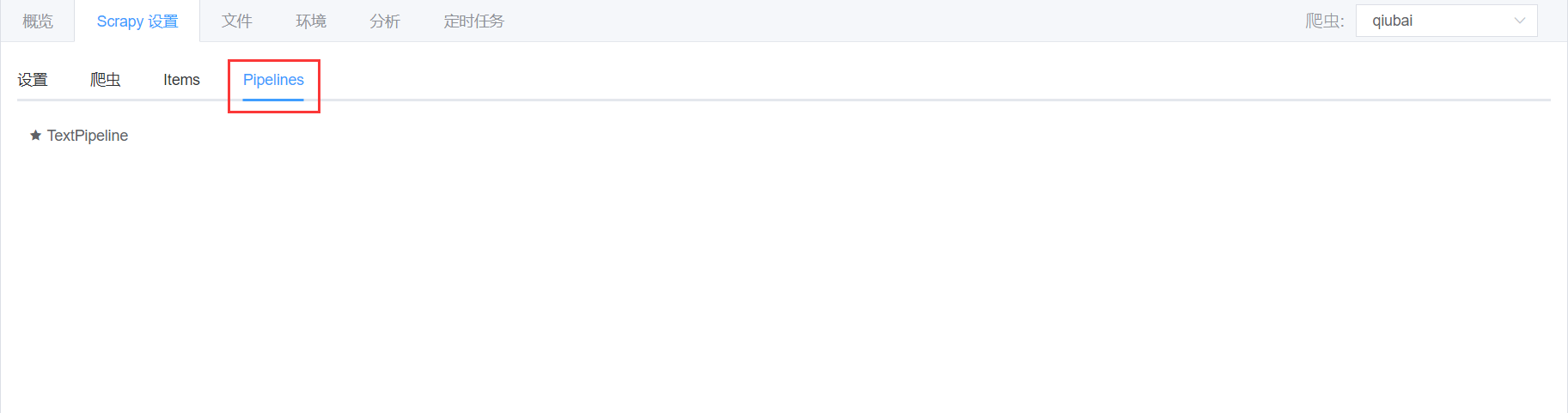 - 第一个默认标签是【设置】,这是 Scrapy 爬虫的设置界面,也就是配置