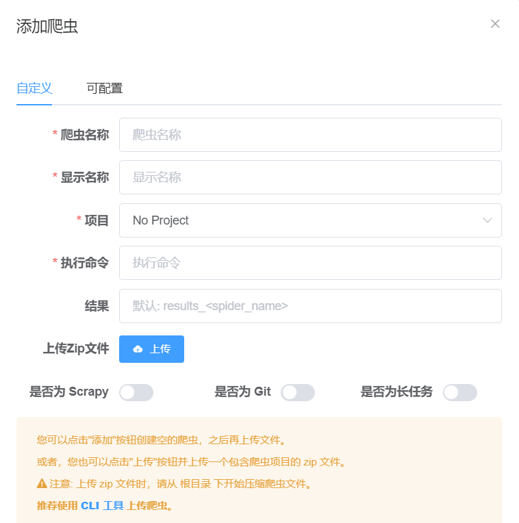 zip格式 - ⚠️注意:您需要在爬虫项目根目录下打包,意思是您需要进入到项目的第一层,将所有文件和文件夹打包成 zip 文件。