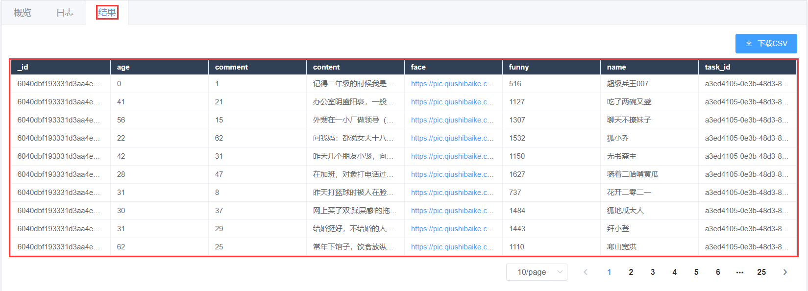 - 在【任务详情页】查看运行【结果】,同时还可以查看【日志】和【概览】