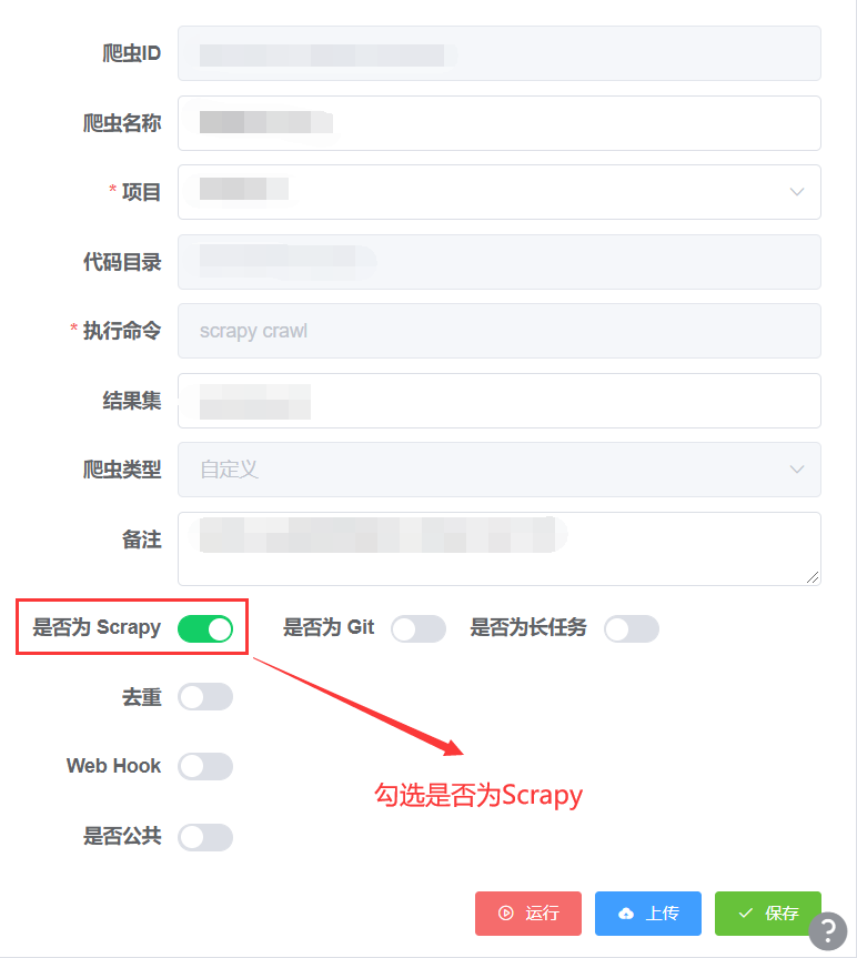 - 上传步骤同上,只需要在创建爬虫或修改爬虫时开启是否为 Scrapy,如图