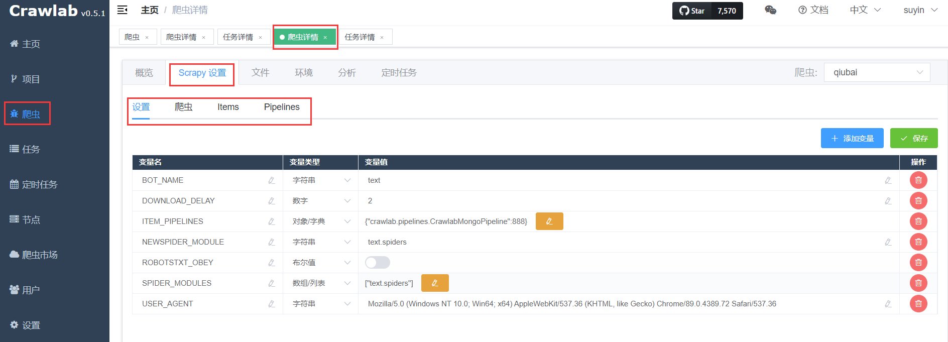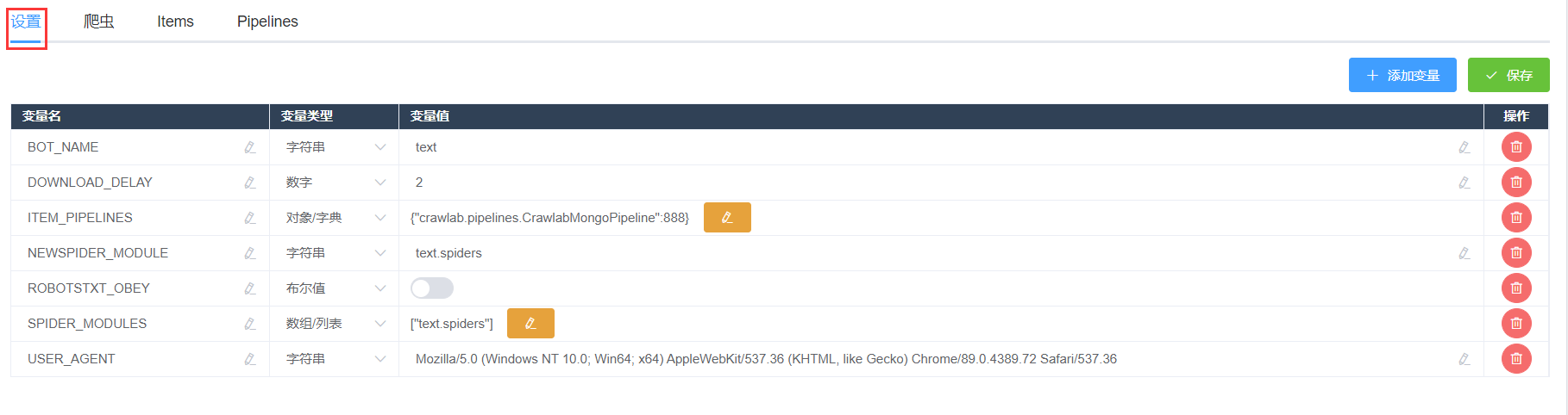 settings.py的地方。Crawlab 会将您 Scrapy 爬虫项目中的settings.py中的变量读取并显示出来。在这里,您可以添加、删除修改任何settings.py中的变量。在修改变量时,别忘记确定变量类型。 - 点击【保存】按钮后,您的设置就保存在