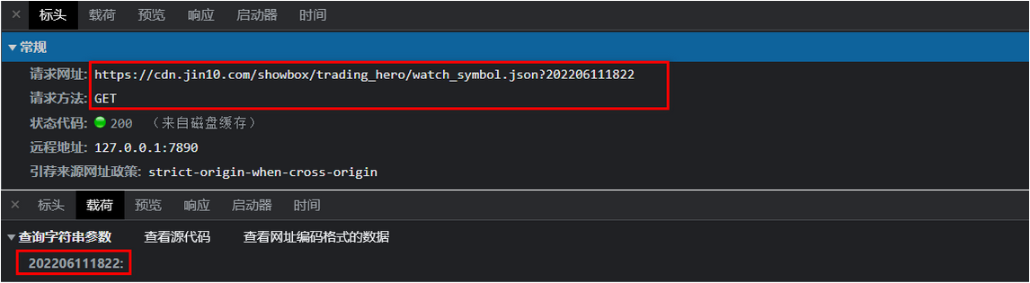 - 查看标头和载荷,可以发现请求链接、请求方法、请求参数,其中请求参数是时间戳,每分钟刷新一次