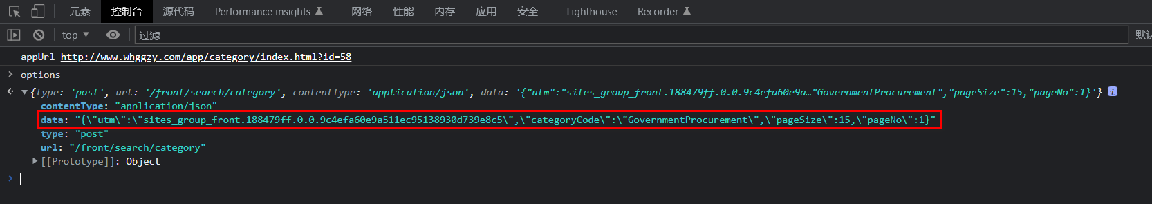 作用域中的options,可以发现接口的请求参数是一个字符串,并不是像我们写的那样是个字典,这个也可以通过在控制台中输入options来查看