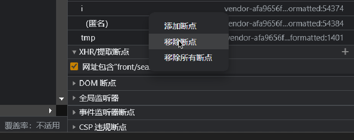 源代码按钮,找到XHR/提取断点,点击+号添加断点,输入刚才复制的路径,然后按回车保存断点 - 保存断点后,按