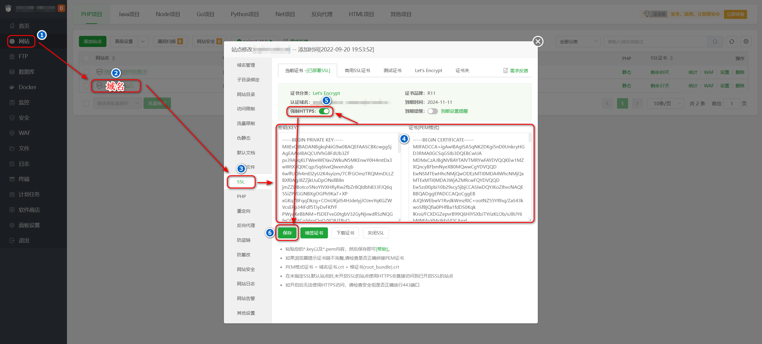 SSL选项中申请证书,然后在设置反向代理。或者设置反向代理之后,关闭反向代理功能,申请SSL证书后再次开启代理。 - 配置 SSL