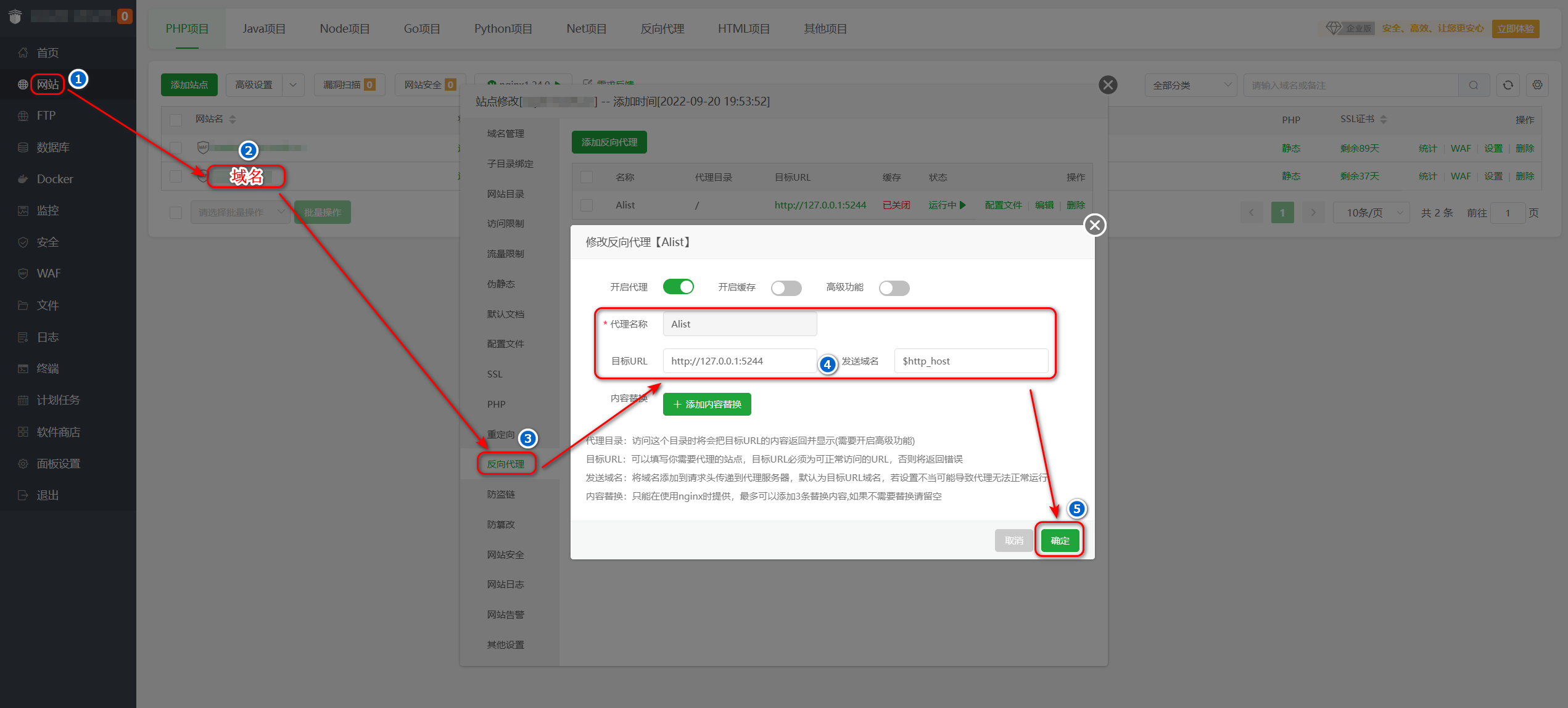 http://ip:5244访问的,为了能够使 OpenList 用https://domain/访问,需要在宝塔中配置 SSL + 反向代理。 - 注意:需先在